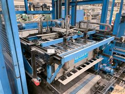 Description/configuration: Palletizing of strapped, film wrapped or loose (product permitting!!) bundles. Infeed with blocking unit & turning device. The palletizer builds single rows of bundles which are combined to a layer. Each finished layer is then placed onto the pallet. Includes pallet conveying and empty pallet terminal.